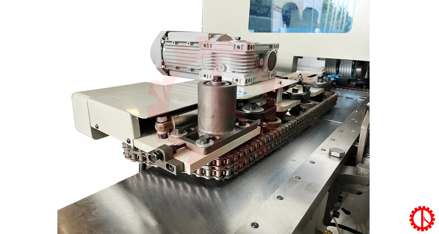- Hệ thống bánh xe đưa phôi làm bằng thép giúp đưa phôi hiệu quả, bền, hạn chế mài mòn.