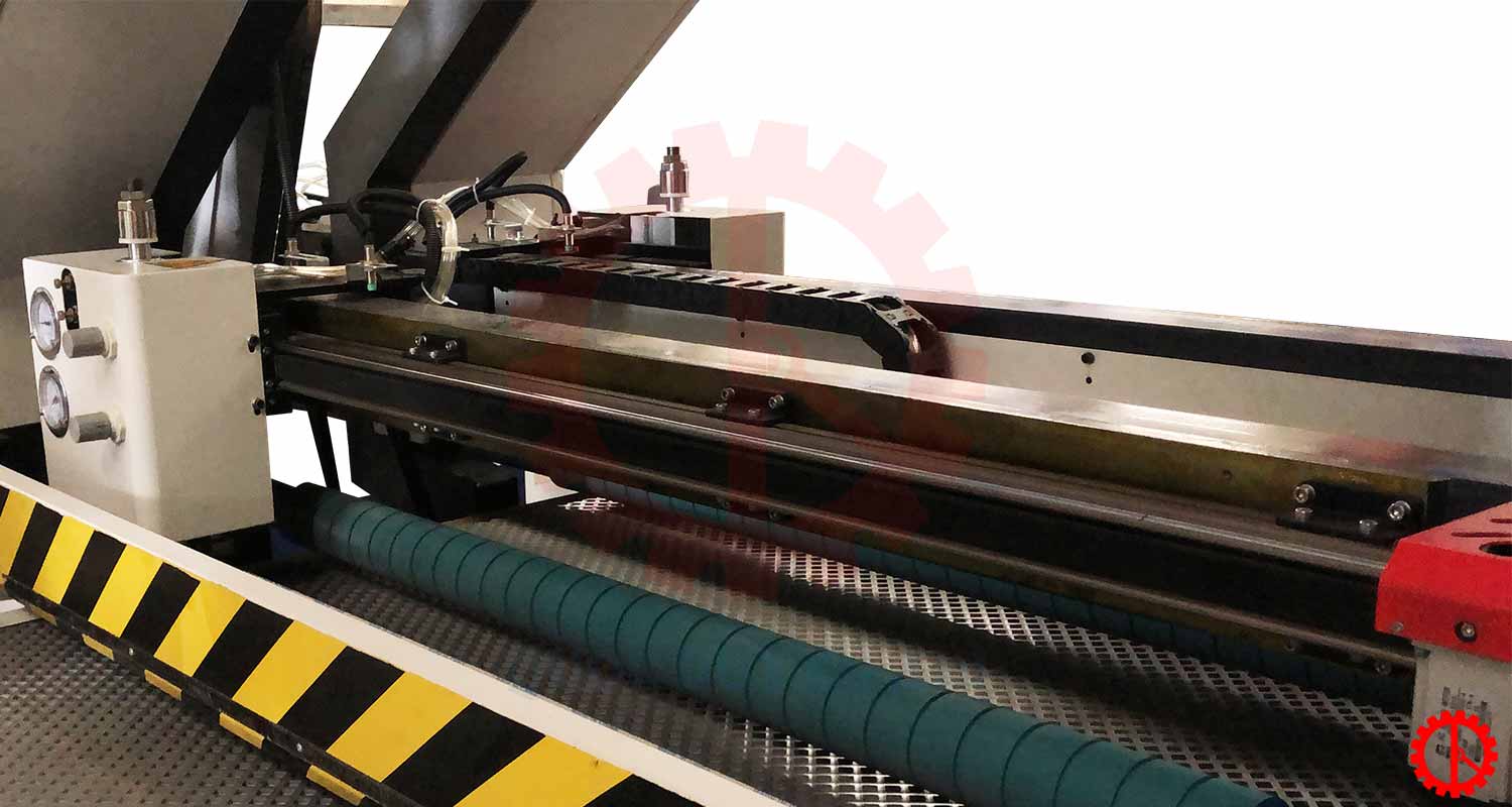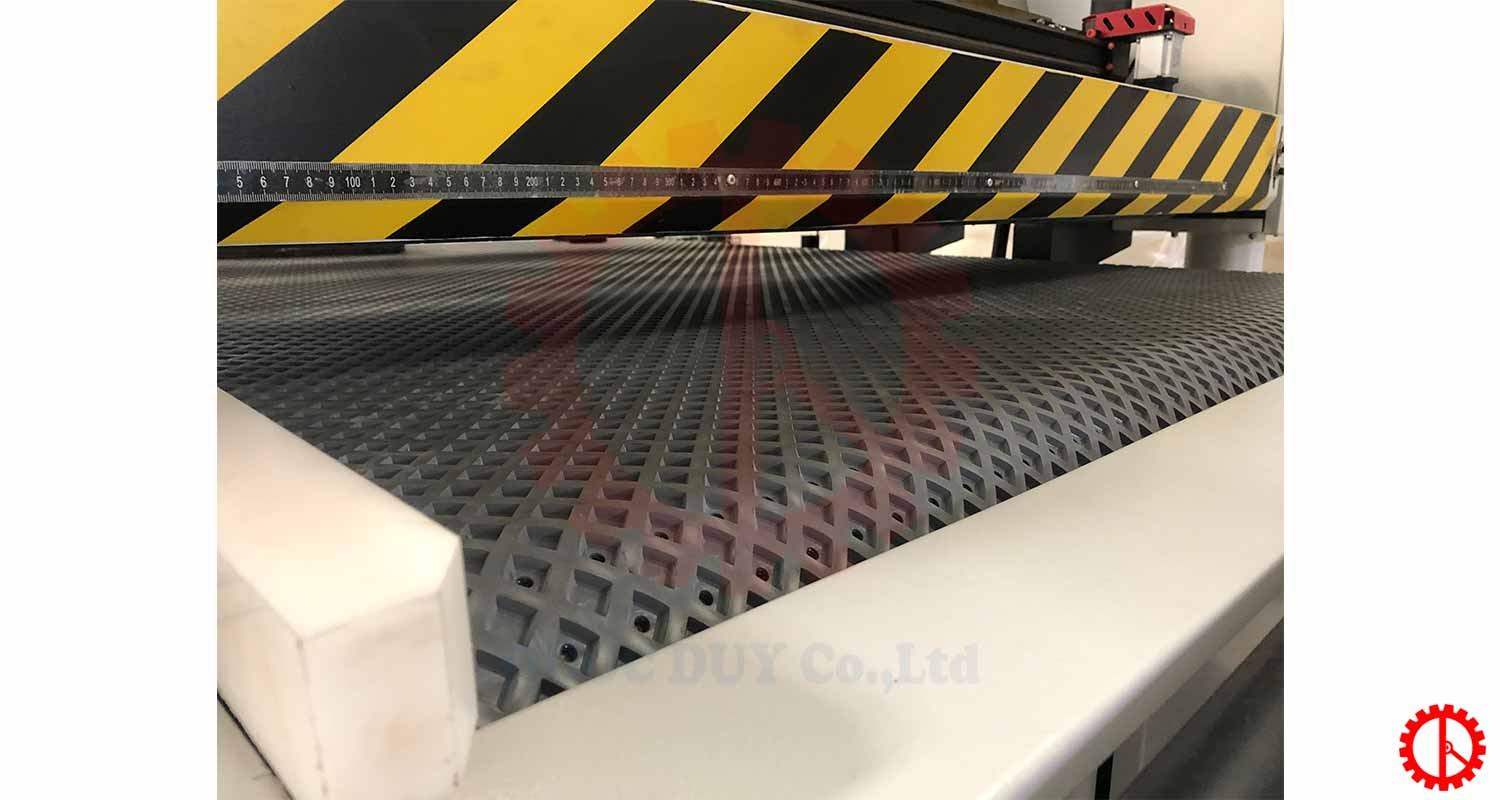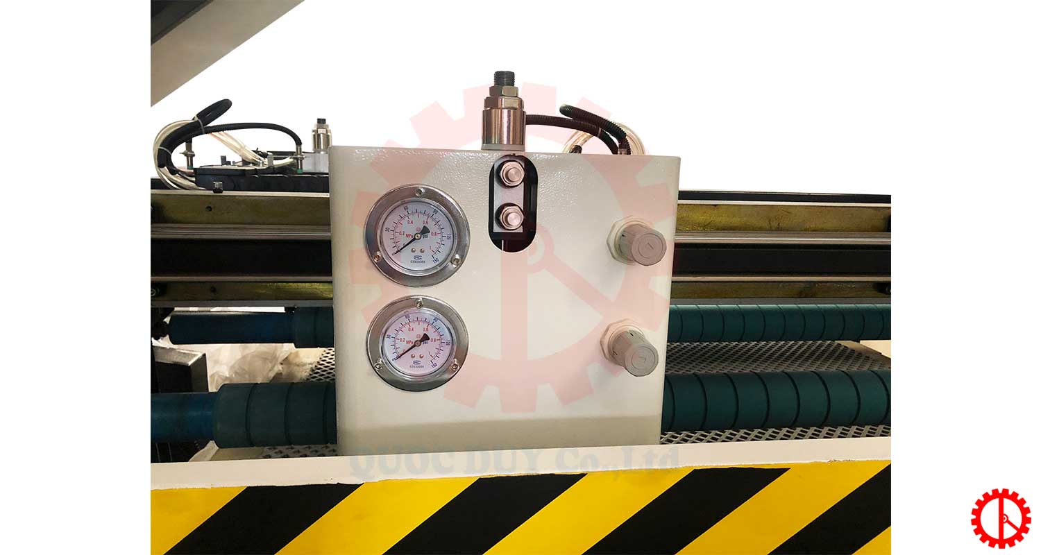 - Chuyển động của đệm tì nhám được điều khiển bằng động cơ servo. Ngoài ra, đệm tì nhám còn có thể điểu chỉnh thời gian lên và xuống đảm bảo không lẹm cạnh của phôi.