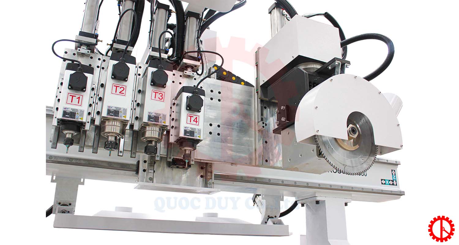 - Máy thiết kế 4 đầu gia công kết hợp với cụm lưỡi cưa xoay 360 độ giúp tốc độ gia công, nhanh chóng, được ứng dụng để cắt, khoan, phay, vát góc 45 độ,..