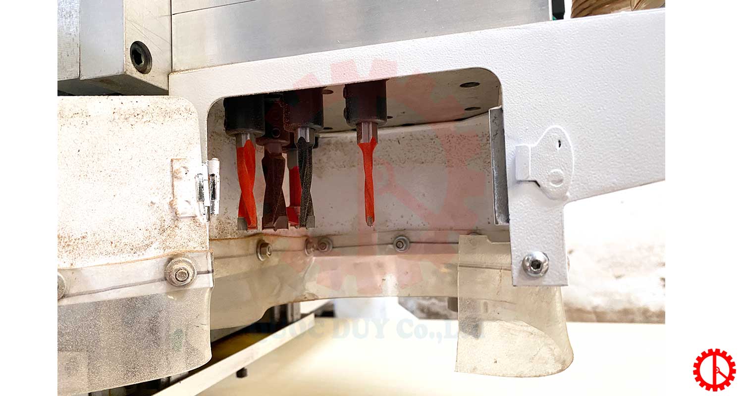 - Máy gồm 1 đầu router HQD công suất 9kw, 1 cụm đầu khoan công suất 1.7kw – gắn 5 mũi khoan