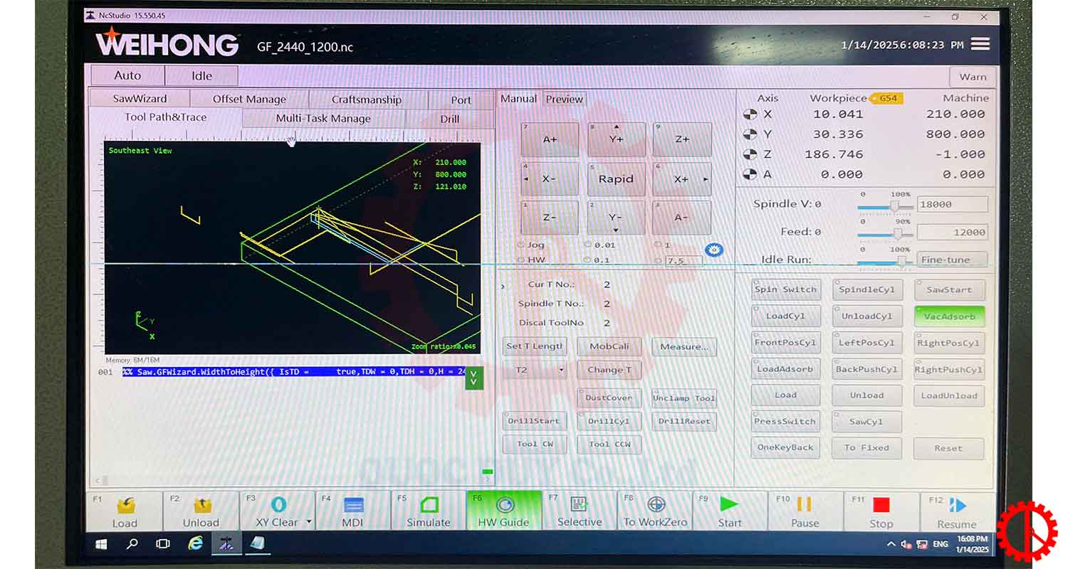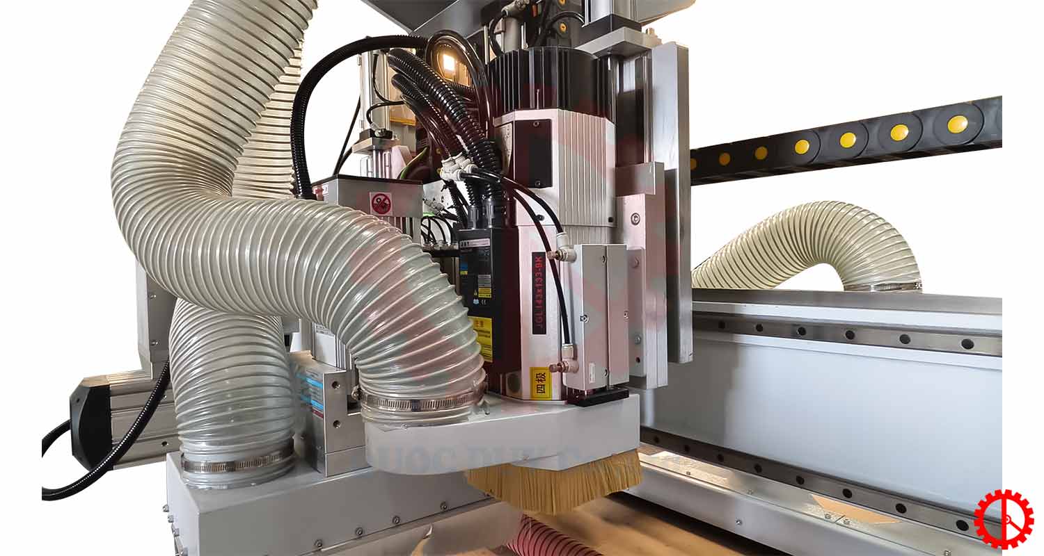 Máy CNC trung tâm 3 trục gia công 5 mặt sở hữu tốc độ làm việc nhanh chóng nhờ cụm gia công trục chính tải nặng, máy được trang bị bàn hút chân không giúp cố định ván trong quá trình gia công.