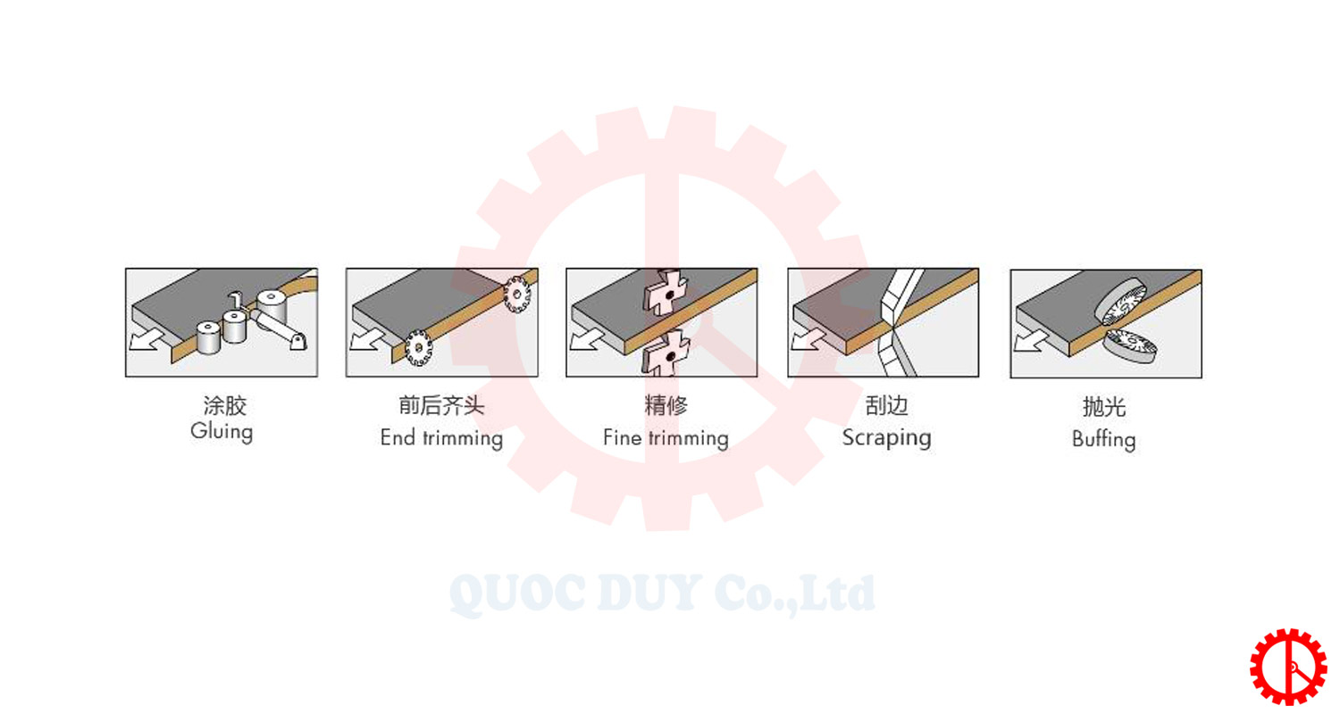 - Với thiết kế 5 chức năng bao gồm lăn keo ép nẹp, cắt đầu đuôi, xén trên dưới, cạo keo, đánh bóng.