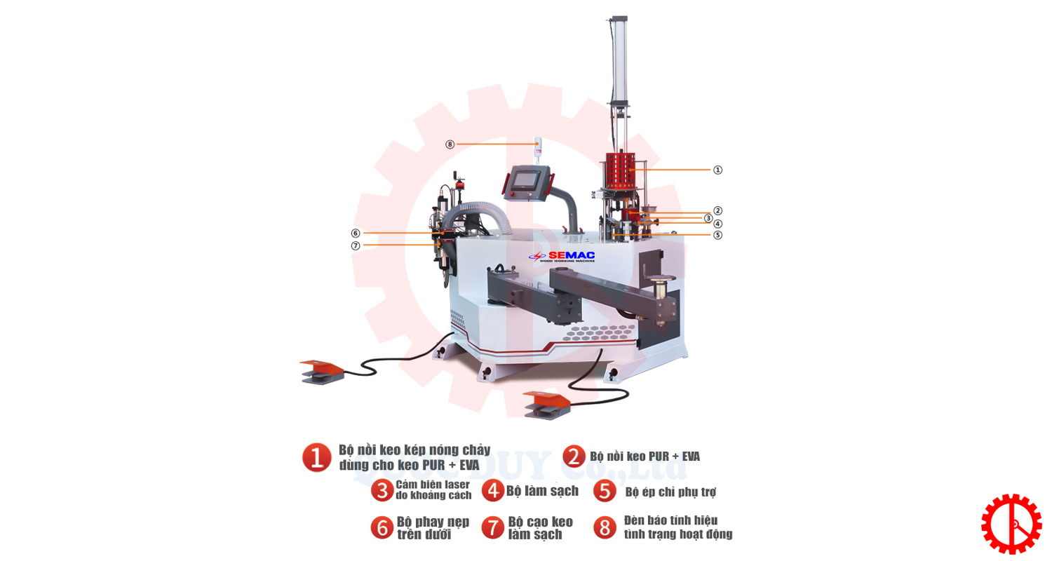 - Nồi keo của máy được tích hợp sử dụng được keo EVA và keo PUR.