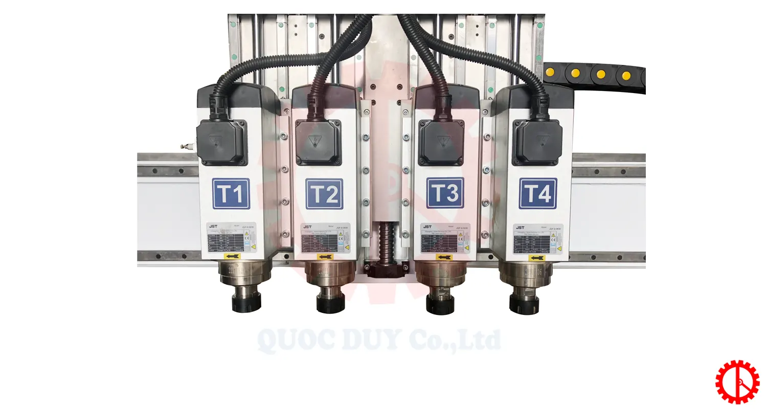 - Máy cnc gồm 4 đầu gia công với công suất lớn 6 kw trên mỗi trục router.
